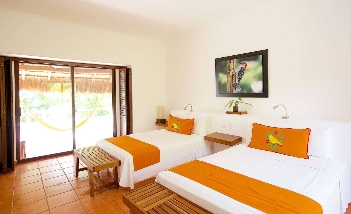 Our exclusive suite offers a spectacular terrace with views of Bacalar Lagoon, where you can relax in a hammock and enjoy the peaceful surroundings. The room has two double beds to ensure a comfortable and enjoyable stay. Come and discover the beauty of Bacalar from this exclusive suite! Maximum capacity: 4 guests.